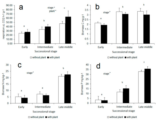 The overall increase of nutrients in the microbial biomass cannot only be explained by the plain increase in microbial biomass itself because the largest increase in the amount of microbially bound nutrients occurred between the intermediate and late middle successional stages, when microbial biomass C mostly stagnated (Figure 2b–d). This suggests that a change in microbial community composition may contribute to the observed nutrient increase in the microbial biomass. This is supported by the ergosterol contents (Table 1), which increased relatively more than microbial biomass C, suggesting a shift from a bacterial to a more fungal dominated microbial community in later successional stages. Soil fungi are known to accumulate P in the form of polyphosphate []. A relative increase of fungi may also be the reason for the tendency of microbial biomass N and P contents being higher in later successional stages in the presence of plants because plants are often associated with mycorrhizal fungi [,]. This can also explain the observed higher microbial respiration in the presence of plants (Figure 2a).