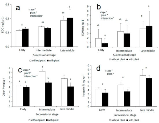 The contents of EOC, EON, Olsen P, and inorganic N in soil were affected by both plant presence and successional stage (two-way ANOVA; Figure 3). EOC, EON, and Olsen P were additionally affected by an interaction of plant presence/absence and successional stage (two-way ANOVA; Figure 3). The contents of EOC, EON, and inorganic N were highest in the late middle successional stage (Figure 3a,b,d). Only Olsen P peaked in the intermediate successional stage (Figure 3c). The results showed that the presence of A. elatius reduced the content of Olsen P in the intermediate and late middle successional stages and also tended to reduce the content of inorganic N, though this effect was not significant (Figure 3d).