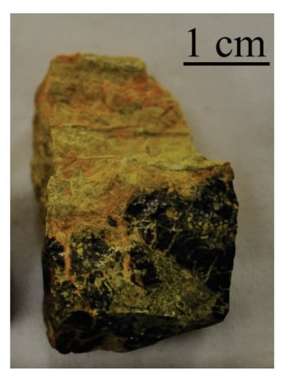 The granite-related sample is from Jachymov, Czech Republic. This uranium deposit is related to Erzgebirge granites generated during the collisional stage of the Variscan Orogen, where late Carboniferous granites intruded metamorphic rocks, primarily mica schists and phyllites [,,]. The primary uranium mineralization was dated at 260–285 Ma by U–Pb analysis of uraninite [,].