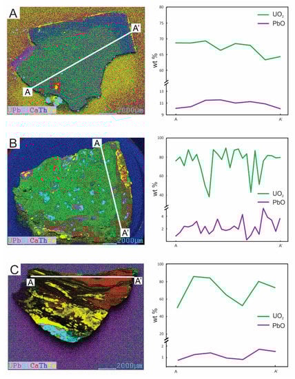 XRF elemental maps for three uraninite samples investigated here: (A) Bancroft, (B) Marshall Pass, and (C) Adair Mine are shown on the left. Each of the XRF maps has a transect indicated A to A’, which corresponds to the UO2 and PbO abundances profile given in the line graphs. The transects illustrate the degree of alteration within each sample.