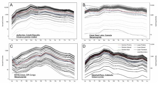- Lach, P.; Mercadier, J.; Dubessy, J.; Boiron, M.C.; Cuney, M. In situ quantitative measurement of rare earth elements in uranium oxides by laser ablation-inductively coupled plasma-mass spectrometry. Geostand. Geoanalytical Res. 2013, 37, 277–296. [Google Scholar] [CrossRef]
