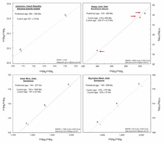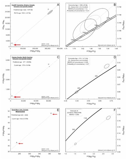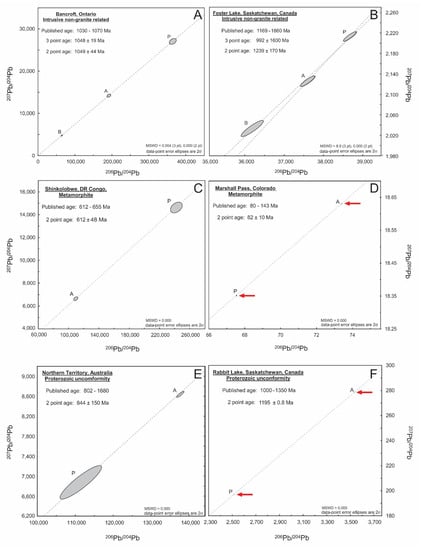 Secondary Pb–Pb isochron for the remaining 2 intrusive non-granite related samples, (A) Bancroft, and (B) Foster Lake, two metamorphite deposit related samples, (C) Shinkolobwe, and (D) Marshall Pass, and the Proterozoic unconformity related samples, (E) Northern Territory, Australia, and (F) Rabbit Lake. Symbol size (including associated uncertainty) for certain analyses are difficult to see, due to large range (scaling) of Pb isotope compositions. Therefore, a red arrow is shown to indicate the position of these analyses.