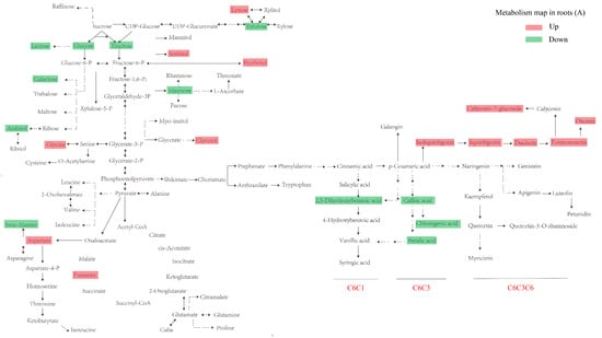 Visualization of primary and phenolic metabolites dynamics on a biochemical pathway map. (A) Metabolism map in roots. (B) Metabolism map in leaves. Compounds in the red box are upregulated by UV-B radiation, and compounds in the green box are downregulated.