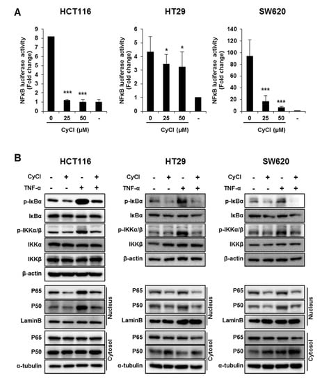 CRC is the third most diagnosed cancer in males worldwide and diverse risk factors, such as familial history, lifestyle, and environmental and genetic elements, can influence the development of CRC [1,2]. Several inflammatory cytokines and growth factors have also been reported to mediate colorectal carcinogenesis, and the severity of inflammation has been directly related to CRC risk [2]. Especially, TNF-α has been studied as one of the important factors involved in the pathogenesis of CRC [28]. TNF-α affects not only cell growth, differentiation, and function but also causes genetic mutations promoting cancer development, and modulates the expression of inflammatory genes [29,30,31]. Therefore, we used TNF-α stimulation to potentiate the malignant phenotype of colon cancer cells in this study. Most genes regulated by TNF-α have a site that binds to the transcription factor NF-κB [31]. A considerable amount of literature has shown that activation of the NF-κB signaling pathway may cause CRC [2], in which NF-κB acts as a key mediator of cellular proliferation and apoptosis [32]. In the present study, we evaluated the efficacy of CyCl on NF-κB signaling in TNF-α treated colon cancer cells. We found that CyCl treatment was able to inhibit the transcriptional activity, nuclear translocation, and upstream signaling of the NF-κB pathway as well as the activation of NF-κB-regulated genes. These results indicate that CyCl may effectively reduce the inflammation and proliferation associated with NF-κB signaling in CRC.