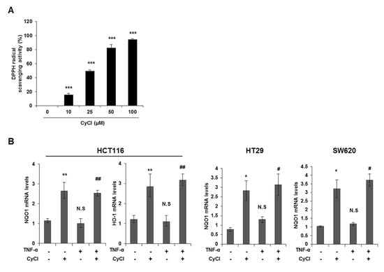 CyCl induces Nrf2 activation and the expression of antioxidant enzymes. (A) 2,2-Diphenyl-1-Picrylhydrazyl (DPPH) radical scavenging activity (%) of CyCl. (B) HCT116, HT29, and SW620 cells were treated with TNF-α and 50 µM of CyCl and incubated for 24 h. RNA was extracted from the cells and mRNA expression of NAD(P)H quinone dehydrogenase 1 (NQO1) and heme oxygenase-1 (HO-1) was measured by qRT-PCR analysis. (C) HCT116, HT29, and SW620 cells were treated with TNF-α and 50 µM of CyCl and incubated for 24 h. Protein extracts were separated by SDS-PAGE and Western blot analysis was conducted for the expression of NQO1 and HO-1 protein. (D) Representative immunoblots of nuclear and cytosolic proteins demonstrating changes in the subcellular localization of Nrf2 following CyCl treatment in TNF-α-stimulated cells. The quantitative results are expressed as the mean ± SD of three independent experiments. (E) HCT116, HT29, and SW620 cells were transiently transfected with Nrf2-Luc plasmids for 24 h and treated with 50 µM of CyCl for 24 h. Cell extracts were harvested, and luciferase assays were performed. All experiments were carried out in triplicate. * p < 0.05, ** p < 0.01, and *** p < 0.001, significantly different compared with control; # p < 0.05 and ## p < 0.01, significantly different compared with TNF-α-treated cells.