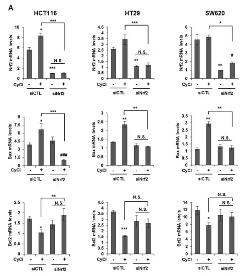 Knockdown of Nrf2 by Nrf2 small interfering RNA (siRNA) abolishes CyCl-induced apoptosis. (A) HCT116, HT29, and SW620 cells were transfected with 15 nM of control or Nrf2 siRNA. After 24 h, cells were treated with 50 µM of CyCl for 24 h and harvested. The expression of Nrf2, Bax, and Bcl2 mRNA was measured by qRT-PCR. (B) HCT116, HT29, and SW620 cells were transfected with 15 nM of control or Nrf2 siRNA for 24 h and treated with 50 µM of CyCl for 24 h. After protein isolation, Western blot analysis was conducted for the levels of cleaved caspase-3, Bax, and Nrf2 protein. (C) HCT116 cells were transfected with control or Nrf2 siRNA for 24 h and treated with 50 µM of CyCl for 24 h. Cell viability was evaluated by 3-(4,5-dimethylthiazol-2-yl)-2,5-diphenyltetrazolium bromide (MTT) assay. All experiments were carried out in triplicate. * p < 0.05, ** p < 0.01, and *** p < 0.001, significantly different compared with empty vector-transfected control; # p < 0.05 and ### p < 0.001, significantly different compared with siNrf2-transfected control.