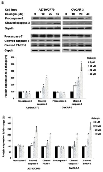 The Caspase-Glo 3/7 Assay kit and Western blot assay were employed after A2780/CP70 and OVCAR-3 cells were treated with galangin. Figure 5A shows that when cells were treated with 40 μM galangin for 8 h, caspase-3/7 enzymatic activities were maximally increased to 1.48 ± 0.06-fold and 2.35 ± 0.20-fold in A2780/CP70 and OVCAR-3 cells, respectively, as compared with controls. Figure 5B shows that galangin significantly up-regulated the levels of cleaved caspase-3, caspase-7 and PARP-1, and down-regulated the levels of procaspase-3 and procaspase-7 in the two ovarian cancer cell lines.