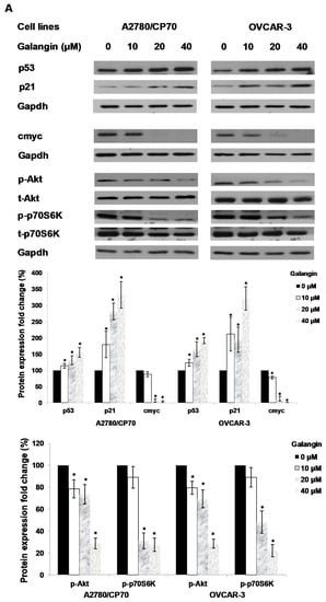 Human ovarian cancer cells, A2780/CP70 and OVCAR-3, were seeded into 60-mm dishes at a density of 1 × 106/dish and incubated overnight before being treated with galangin at different concentrations (10–40 μM) or DMSO for 24 h. After being washed with PBS, cells were lysed in extraction reagent (100 µL Mammalian Protein Extraction Reagent (M-PER, Pierce, Rockford, IL, USA), 1 µL Halt Protease, 1µL Phosphatase Inhibitor and 2 µL EDTA). A BCA Protein Assay Kit (Pierce) was employed to detect total protein levels. Protein bands were quantitated using NIH ImageJ software (National Institutes of Health, Bethesda, USA) before being normalized to corresponding Gapdh bands for analysis. The data were expressed as a percentage of the untreated (DMSO only) control value.