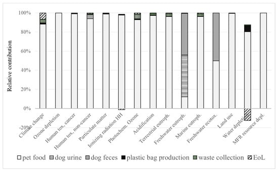 The contribution of the different life cycle stages/processes within the product system of a dog to the total result is displayed in Figure 2. Except for the impact categories of freshwater eutrophication potential and freshwater ecotoxicity potential, the main contribution to all the impact categories comes from the life cycle stage pet food. Here, the impact in most categories is mainly caused by the processes ´ingredients´ and ´packaging production’ []. The category of freshwater eutrophication is mainly determined by the dog´s urine (around 44%) and the dog´s feces (around 43%). This is mainly caused by phosphorous contained in the excrements. Urine does not contribute significantly to any other category, while feces have a significant contribution (around 50%) also to the category of freshwater ecotoxicity potential. Impacts related to the plastic bag production are visible in the category of water depletion potential (around 9%). Impacts related to the waste collection step are not visible in several categories but never exceed 5%. Relevant contributions of the EoL stage, which, in Figure 2, include the incineration and landfill of municipal waste, can be seen only for the category of climate change potential (around 7%). The negative values in the impact category water depletion result from credits provided for waste treatment/incineration in the EoL stage due to energy recovery.