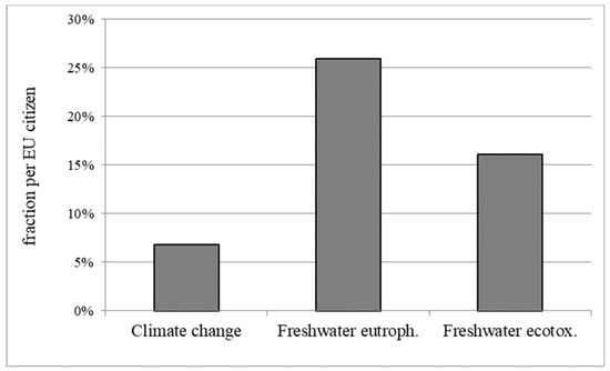 Due to the difficulties related to normalization, Figure 3 shows the normalized results of the case study only for three selected impact categories: Climate change, the only impact category (next to particulate matter), which is characterized with a very high robustness level, according to [], and freshwater eutrophication and freshwater ecotoxicity. Though the latter two categories are characterized with medium to low and low robustness level, we decided to show their normalized results because both categories are highly influenced by the dog´s excrements. The normalized results in Figure 3 are expressed as fraction per EU citizen, i.e., the results for the individual impact categories are all compared to the annual impact of an average EU citizen. Moreover, MFR resource depletion, as well as human toxicity cancer and non-cancer effects, has large fractions, but as those impact categories are mainly driven by the pet food, they are not displayed in Figure 3. The normalized results for all impact categories can be found in the Supplementary Materials (Figure S1).