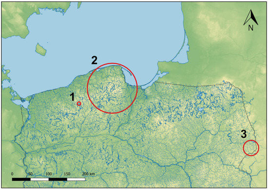 Research locations associated with the three case studies mentioned in the text: 1—Central Pomerania (Wierzchowo Lake micro-region); 2—Eastern Pomerania; 3—The Białowieża Forest.