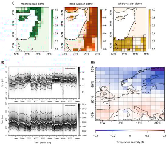 The described methods of the Collaborative Research Centre (CRC) 806 B3 project provide spatial and diachronic reconstructions of climate and vegetation in the past. Here we show examples of the three methods: (I) Probable biome distribution in the Eastern Mediterranean region during Marine Isotope Stage 3. Modeled probabilities for each biome (color range) differ from today’s biome distribution (grey grids). Modified after []. (II) Diachronic climate reconstruction (winter temperature and annual precipitation) based on fossil pollen data from a Holocene sediment core from the Dead Sea. Marginal probability density of reconstruction (color range) with interdecile range (outer full lines), interquartile range (hatched area), mode (black line), expectation value (thick white line), and partial linear trends (thin white lines). Reprinted from [] with permission from Elsevier. (III) Difference between assimilated temperatures (using paleo proxy data combined with paleo climate model simulations from the PMIP3 ensemble) and the PMIP3 multi-model mean, for winter temperatures during the Mid-Holocene. Modified after [].