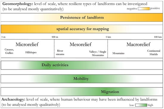 Abtiotic landscape parameters such as a very smooth or rough topography are also highly affecting the way in which humans have lived in a given landscape. However, the modeling and mapping of paleoenvironments in context of Pleistocene human behaviour tend to focus on parameter such as climate, vegetation or associated biomes. They represent mainly direct and indirect biotic parameters. As an additional important abiotic parameter, the impact of topography at various scales in the spatial analysis of a given landscape with regard to geoarcheological questions has been discussed with case studies from Northeast Africa and the Eastern Desert of Egypt []. Two issues in particular are of major importance in geomorphometry: the spatial resolution of a DEM, and the spatial scale of landforms under consideration. A clear identification of various scales is important, as geomorphometry operates on a wide spectrum of scales ranging from a few millimetres up to several hundreds of kilometres, resulting in a wide range of landforms. It is discussed what the topography can contribute to the characterisation of a given landscape at various scales, where hunter-gatherers have lived and how this can be integrated into the characterisation of paleolandscapes with particular focus on human behaviour at different scales (see Figure 7).