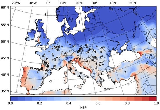 Estimation of the human existence potential (HEP) of the cold stadials during the Aurignacian technocomplex. Excavation sites are presented as white squares.