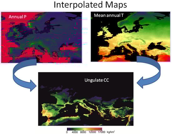Example of the estimation of ungulate carrying capacity (Ungulate CC) in southern Europe for the period 1.6–1.07 Ma. from interpolated maps of annual rainfall (Annual P) and mean anual temperature.