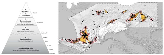 “Extended Areas” constitute the next scale level (Figure 11), describing an interconnected social/economic area of past societies, obtained through superimposition of Core Areas and evidence on lithic raw material transport (for more details see []). Other archeological correlates for economic or social contact might be added at this scale level. Since Extended Areas—by definition—include information on human mobility and interaction, they provide meaningful spatial data to model cultural adaptation to environmental conditions (see [] and references therein for a similar application).