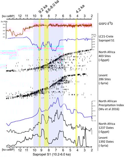 In contemporary archeological research, the domestication of plants and animals in the Near East during the Early Holocene is alternatively interpreted as an overall slow and gradual, or else as rapid process. Both positions are supposedly supported by 14C-radiometric data, but which is of generally low quality. A recent chronological re-analysis [] of the archeological, archeobotanical and archeozoological data confirmed that the wild-domestic-transition (WDT) was indeed initially slow (millennial scale), but terminated at 10.2 ± 0.2 ka calBP with an abrupt switch to herding and agriculture. Interestingly, the WDT is itself synchronous with an abrupt climatic switch to higher precipitation, as documented in marine and terrestrial climate records in the Mediterranean and adjacent regions (e.g., Levant, Iran). The WDT is immediately associated with the onset of Neolithic dispersal out of the Fertile Crescent into Central Anatolia, and from the Northern into the Southern Levant. From the viewpoint of Complex System Theory (Niche Construction, Punctuated Equilibrium), it appears possible to understand the rapidity of WDT as due to amplification with feedback (i.e., resonance) for a small number of causal factors, abbreviated: human agency tightly coupled with the genetic properties of domesticates and enhanced water availability. In the present paper, we compare the eMed (Neolithic) response to the precipitation increase at 10.2 ka calBP (Sapropel S1) with the response of contemporaneous Hunter-gatherer (Epipaleolithic) societies in the wMed (Iberian Peninsula (IP), North Africa, Saharan Regions). The method applied is large-scale combination of paleoclimate records with archeological 14C-data using the method of Barcode Seriation (see Figure 15).