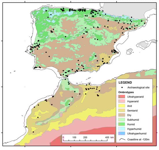 Archaeological sites with Solutrean, Magdalenian, or Iberomaurusian occupation layers on an ombrotype map of the Worldwide Bioclimatic Classification System (1996–2015) for Iberia (original scale 1:1 Mio.) and Africa (original scale 1:25 Mio.). Source: [].