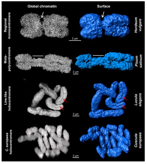 Different centromere types of somatic plant metaphase chromosomes. Images were obtained via global chromatin labelling by DAPI. After surface rendering of structured illumination microscopy (SIM) image stacks [] using the Imaris 8.0 software, the centromere structure variability of different plant species becomes visible. Regional monocentromeres are characterized by a district primary constriction (white arrows). Meta-polycentromeres represent an elongated primary constriction (region indicated by dashes). Line-like holocentromeres are characterized by the arrangement of centromere-specific proteins in a distinct line within a groove (red arrows), as found in Luzula and Rhynchospora (Figure 3). Holocentromeres in Cuscuta europaea are structures where spindle fibres attach along the whole chromosome at centromere-specific histone H3 (CENH3)/centromere protein A (CENP-A)-chromatin as well as at CENH3/CENP-A-free regions (see also Figure 2 and Figure 4), but the surface is relatively smooth without a specific constriction.