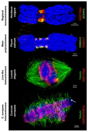 A specialized monocentric organization has been found for mitotic chromosomes in Pisum and Lathyrus species [,,]. In these species, primary constrictions span up to a third of the chromosome length, corresponding to 263 Mbp, and contain up to five explicit CENH3/CENP-A-containing domains. All these domains contain both CENH3/CENP-A variants (CENH3-1 and CENH3-2) identified in these species and assemble on arrays of satellite DNA with a length varying from hundreds of kilobases to almost 3 Mbp. Thus, each of these domains can be viewed as one regional centromere. Individual CENH3/CENP-A-containing domains are particularly well discernible from prophase to prometaphase, but when condensation proceeds towards metaphase, they attach to each other or even merge into line-like structures similar to holocentromeres. H2AT120ph chromatin surrounds the CENH3/CENP-A regions, but does not intermingle with them. Microtubules of the mitotic spindle attach to chromosomes at each CENH3/CENP-A-containing domain or along the entire CENH3/CENP-A-containing line-like region, indicating that CENH3/CENP-A is a faithful marker of functional kinetochores in these species (Figure 4). Although these centromeres are functionally similar to monocentromeres, they were designated as “meta-polycentromeres” to reflect the unique organization of CENH3/CENP-A-containing chromatin domains.