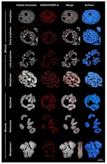 To decipher the structure and organization of centromeres, super-resolution microscopy, beside other microscopy techniques, has been applied. Super-resolution microscopy techniques, such as spatial structured illumination microscopy (3D-SIM), are subdiffraction imaging methods bridging the resolution gap between light and electron microscopy [,,,,,]. 3D-SIM allows, compared to other super-resolution microscopy techniques, fast high throughput multicolor imaging by doubling the resolution of wide-field microscopy and achieving best contrast in thin specimens []. Super-resolution microscopy was applied successfully in cell biology [,,] to specimens from both prokaryotes and eukaryotes and allowed discovery of new structures within mammalian [] and plant chromatin [].