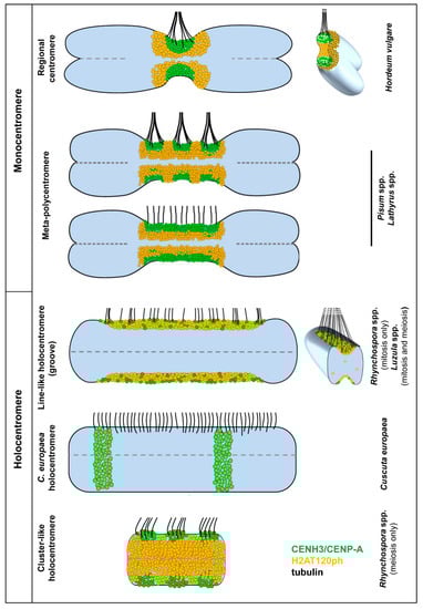 Line-like contiguous holocentromeres within a groove were first identified in Luzula (Juncaceae) species during mitosis and meiosis [,,,,]. Later on, a similar line-like holocentromere structure and arrangement was found during mitosis in related species of the genus Rhynchospora (Cyperaceae) [,]. In both cases, line-like holocentromeres show similar localization of CENH3/CENP-A and H2AT120ph and complete association to spindle microtubules during mitotic cell divisions [,]. Interestingly, holocentromeres in Rhynchospora were also associated with centromere-specific DNA sequences (tandem repeats and centromeric retrotransposons of maize) [], while in Luzula, no centromere-specific repeats have been found.