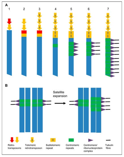 Models to expand centromeres. (A) “Telomere to centromere” model based on Villasante et al. [,]. (1) Different retroelements are mobilized to heal the DNA ends of a broken chromosome. (2) The most effective telomeric retrotransposons become selected. (3) Retrotransposons with a more effective capping capability are selected. (4) Subtelomeric repeats appear. (5) Subtelomeric repeats are amplified and become centromeric repeats. Ribonucleoprotein complexes are formed after transcription of theses repeats. (6) Centromeric repeats become a protocentromere after being recognized by microtubules. (7) Chromosome wide extension of the centromere to form a holocentromere. (B) “Centromere drive model” of Henikoff et al. []. The expansion of a satellite that binds CENH3/CENP-A provides more microtubule attachment sites. This stronger centromere drives in female meiosis into the egg cell.
