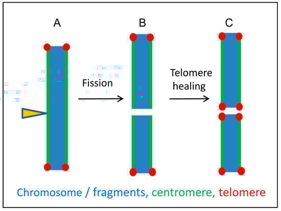 A model illustrating possible karyotype alterations after fragmentation of holocentric chromosomes based on the interplay between holocentricity and telomere healing. (A) Irradiation of holocentric chromosomes (arrowhead) induces chromosome fragments. Centromere activity is present along all chromosome fragments. (B) Broken ends lack telomere repeats and become gradually healed (C) by de novo telomere syntheses. Based on Jankowska et al. [].
