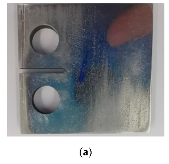 The axial fatigue life and the lateral fatigue life were obtained from the MTS tester. The fatigue life of the two control groups was also collated, as shown in Table 2. The data in Table 2 show that the difference between fatigue life of CT specimens measured at different frequencies is small, revealing that the frequency, f, has little effect on the fatigue life in this experiment, and we do not discuss it later. It can be drawn from Figure 4 and Table 2 that the smaller the stress ratio, R, is, the faster the crack propagates steadily, and the smaller the fatigue life, N, is. This is because the reduction of the stress ratio leads to a reduction in the crack closure stress level, which in turn leads to a reduction in the crack closure effect [24]. The crack closure effect hinders the crack propagation, so the reduction of the crack closure effect results in an increase in the crack propagation rate. The cracks in this paper are open-type cracks and belong to mode Ⅰ crack. When the external force reaches a certain level, the crack suddenly expands and ruptures, that is, it reaches a critical state. This is KI = KIC. When the stress intensity factor is greater than the fracture toughness of the crack, the crack propagates, and when the stress intensity factor is less than the fracture toughness, the crack stops cracking. The value of KIC in this article is 496.6 Mpa·m1/2.