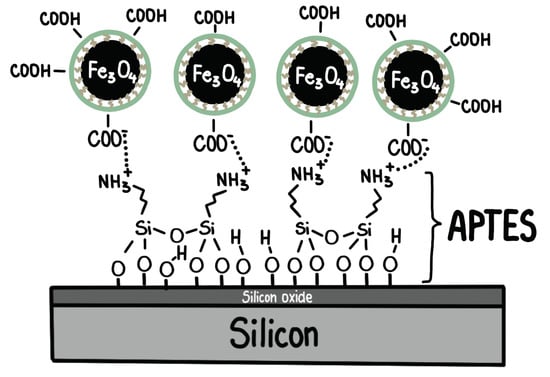 Alternatively, (3-aminopropyl)triethoxysilane (APTES) can be coated onto a silicon wafer to provide a template for wetting nanoparticles when the FF is in contact []. The APTES layer introduces a positive partial charge on the surface that provides anchors for the negatively-charged carboxylic groups of the NP coating (Figure 2b). This configuration results in an even stronger affinity between the magnetic NPs and the silicon surface. The interaction between the carboxylic groups in the NP shells and the silane groups in the APTES layer is depicted in Figure 3.