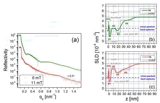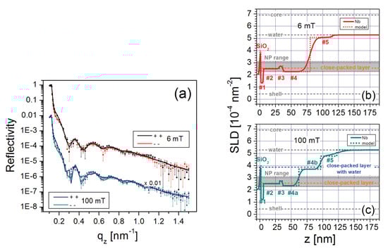 Dense, well-defined NP layers were reported to form on top of a (3-aminopropyl)triethoxysilane (APTES) coating on a silicon wafer []. The dilute FF mixture (i.e., nominal concentration of 0.15 vol% FeO) used for this investigation contained monocrystalline, spherical magnetite NPs with a core diameter of 25 nm [] coated with a monolayer of oleic acid and a monolayer of an amphiphilic polymer with carboxylic acid. Since the NPs are ferromagnetic at room temperature, they form stable dimer and trimer chains due to dipolar interactions, as revealed by SANS measurements []. Figure 8a shows the PNR as a function of for this sample in magnetic fields of 6 mT and 100 mT. The nuclear SLD profiles extracted from fits to the data (solid lines) are plotted in Figure 8b,c, respectively.