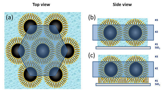Following the silicon oxide base, the SLD profile in 0 mT is explained by a first layer (# 1) that consists of oleic acid associated with the ligand shell surrounding the NPs. The second layer (# 2) is composed primarily of magnetite cores laterally separated by oleic acid and water. Despite nonuniformities among the NP shapes, this layer is densely packed as revealed by comparisons to SLD model calculations shown by the blue dashed line in Figure 5b. The next layer (# 3) consists mainly of ligands, similar to layer # 1. Schematics of the top and side views of the six-fold arrangement of close-packed spherical particles are drawn in Figure 6. The loosely-packed transition layer (# 4) that forms above the wetting layer is illustrated (along with the other layers) in Figure 7. Note that all layers also contain varying amounts of DO/HO.