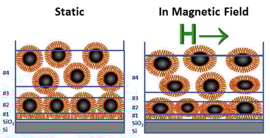When an 11 mT field is applied in-plane, the resultant SLD value for layer (# 2) is higher than in 0 mT. The SLD value derived from the model calculations performed for close-packed spherical particles can no longer describe the experimental data. Instead, rotation of the nanoparticles in the magnetic field increases the packing density and subsequently reduces the effective core and shell thicknesses []. Specifically, the shape anisotropy generates a force that twists the elliptical particles and reorients them with their major axis parallel to the sample surface, as illustrated in the magnetic field model in Figure 7.