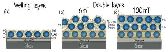 Schematic drawings of NP ordering on an APTES-coated substrate. (a) NP wetting layer (# 1–3), (b) double layer of tilted NP dimers above the wetting layer in a 6 mT field and (c) two distinct NP layers that form above the wetting layer in a 100 mT field [].