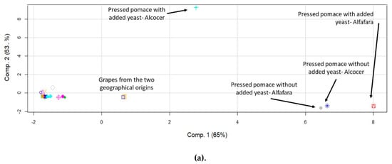 By examining the data for major elements (Figure 2a), it may be observed that some samples separated, according to a component explaining 65% of the total variance of the elemental profile as a function of the fractions under study. Interestingly, pressed pomace and grapes separated from the rest, thus indicating that they had a differentiated elemental concentration profile. The same observation was made by evaluating the results for trace elements in which 80% of the total variance was explained by component 1 (Figure 2b). In both cases, i.e., major and trace elements, component 1 was able to discriminate the geographical origin of the pressed pomace. The situation found for rare earth elements, however, was significantly different, especially for lees. It was figured out that the concentration profiles for these elements were different, as compared to those for liquid fractions and hat. In this case, component 1 explained 75% of the data variability. Again, pressed pomace differentiated from the rest of the fractions, and it was possible to discriminate between the two origins. Rare earth elements, in turn, helped to discriminate between lees and pomace from the remaining fractions.