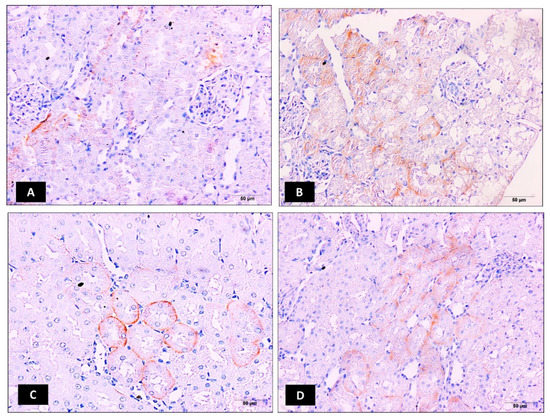 The kidney was weighed and homogenized immediately to obtain 50% (w/v) homogenate in ice-cold phosphate buffer (pH 7.4) + 2% Triton X-100, then centrifuged at 500× g for 10 min at 4 °C. The supernatant was stored at −80 °C for the measurement of oxidative stress measures and antioxidant enzymes [39].