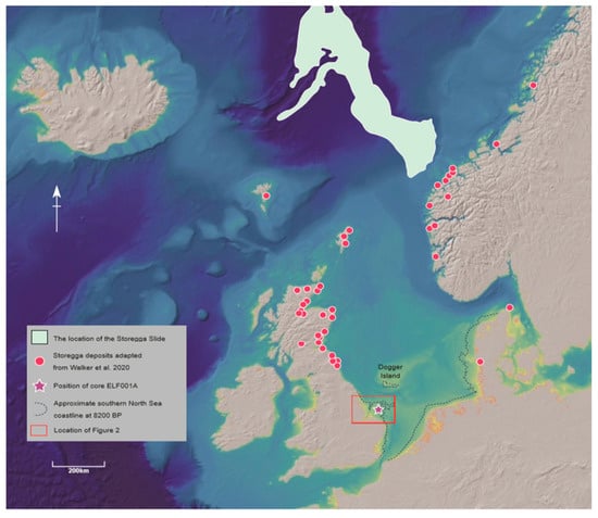The Holocene pre-inundation landscape of the southern North Sea, known as Doggerland, was a gently undulating, low-relief area associated with Mesolithic hunter-gatherer communities []. Sea-level rise during the mid-Holocene period at the regional scale was episodic due to local variations in isostatic rebound, autocompaction of sediments and palaeotidal range. The precise timing and extent of such processes and consequently their impact on Mesolithic communities, remains unclear []. Toward the end of Doggerland, when the majority of the landscape had already been lost, the remaining land would have been low lying, close to sea level, extending out from Norfolk, UK, to an archipelago centred on the Dogger Bank. This low-lying landscape would have therefore been extremely vulnerable to catastrophic flooding events. Significantly, a key regional event during this period was a series of underwater landslides known as the Storegga Event, which occurred off the Norwegian Atlantic coast 8.15 thousand years before present (ka cal BP) [,,,]. This event triggered a tsunami that some researchers have associated with the final submersion of Doggerland [].