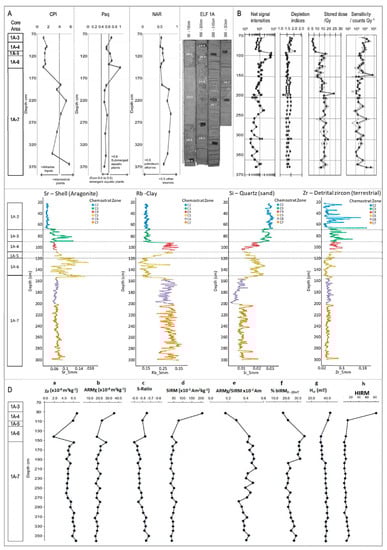 Sediment properties, geochemistry, remnant magnetism and OSL dating results are shown in Figure 3 for the whole core ELF001A and in Figure 4 for the key section of core between depths of 1.00 m and 1.60 m. The geochemical data was acquired at 500 µm resolution but is plotted using a running average of +/−5 mm. A suite of 14 elements had detection limits above background levels including Si, Cl, K, Ca, Ti, Mn, Fe, Ni, Zn, Br, Rb, Sr and Zr. In order to compensate for potential effects of tube aging and beam intensity, the Compton scattering data was ratioed to the Rayleigh scattering data as detailed by Fortin et al. [] to provide a semi-quantitative density value, Rho, for the sediment. Principal component analysis was conducted (SI Text S2.3) to establish potential environmental indicators inferred from the chemical elements and elemental ratios (SI Text S2.1). Elements showing grouping with discriminative signals included detrital (Si, Ni and Zr), clay (K and Rb), carbonate (Ca and Sr) and oxides (Mn, Fe, Ti and Zn) with elements plotting separately including Br, Cl and S. Sr, Rb, Si and Zr were used to chemically zone the core into key chemo-stratigraphic sequences (Figure 3C).