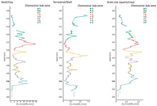 - Sr/Rb—marine signature reflecting the chemical proxy for aragonite as shell content vs. clay content