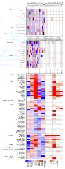 Assessment of taxon change between sample horizons of taxa with abundances >50, see Supplementary Information and SI Text S4.5 for methods. Top Panel—Probability of observed taxa counts between pairs of horizons being drawn from the same distribution. Middle Panel—Index of change between horizons based on changes in maximum likelihood estimators of the probability taxon being selected from each horizon. Blue indicates a decrease in probability moving up the core, red an increase. Bottom Panel—Palaeoenvironmental reconstructionwhere all measurements were taken from lithological units 1A-4 and below. A. Lithological units based on sediment types described in Supplementary Information, Figure S1 and Table S1. Panels B-G palaeoenvironmental proxy abundances, for detailed taxonomic break downs, see Supplementary Information, Table S12, Figures S16–S18 and S19B. Pollen counts. C. Diatom counts. D. Ostracod abundance E. Foramifera abundance. Foraminifera and ostracods are recorded: o—one specimen; x—several specimens; xx—common; xxx—abundant. F. Mollusc counts. G. Plant sedaDNA vegetation type with icon size relative to biogenomic mass.
