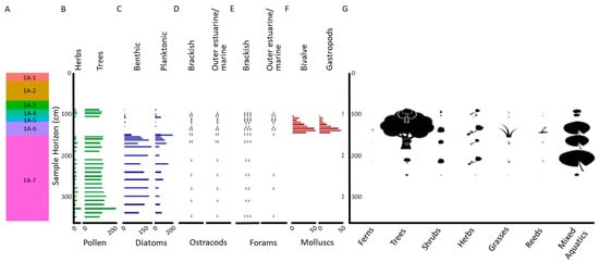 The environment prior to this dramatic event, and recorded in the underlying stratum Unit 1A-7, was an estuarine mudflat typified by predominantly benthic epiphytic and epipelic diatom communities and brackish foraminifera and ostracods, with a sedaDNA floral profile of Zostera and Potamogeton as well as members of the Hydrocharitaceae and Araceae present. This was surrounded by an area with a strong meadow influence that is also apparent in the sedaDNA profile including buttercups, orchids, mallows and asterids. Further, an open woodland is suggested close by, Figure S20.
