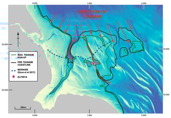 The occurrence of a tsunami deposit at ELF001A, 42 km from its contemporary coastline (Figure 7) is unexpected given previous models have estimated a magnitude of wave that would reach 21 km inland in this area [] before becoming impeded by a glacial moraine belt []. Our reconstruction at approximately 8.2 ka cal BP combined with the modelling of Hill et al. [] suggests that the geomorphology of the landscape could have been instrumental in funnelling the wave inland and along the glacial tunnel valleys that breach the moraine. The Outer Dowsing Deep is one of these valleys (Figure 7) and the passage here is a steep sided U-shaped valley that becomes progressively deeper southwards, towards the central basin. This basin, being below the 8.2 ka cal BP sea level, supports the palaeoenvironmental proxy evidence for an estuarine system. Such a configuration is expected to lead to an intensification of the wave and consequently a significantly enhanced impact []. However, as Bondevik et al. [] have noted, tsunami deposits in different situations ranging from subtidal through intertidal to onshore, are highly influenced by the morphology of the coast which can play an important role in determination of the nature of deposits at any one place in the landscape. For this reason, deposits may be evident at one location but absent in a nearby location and this is the case with some of the cores within this wider study.