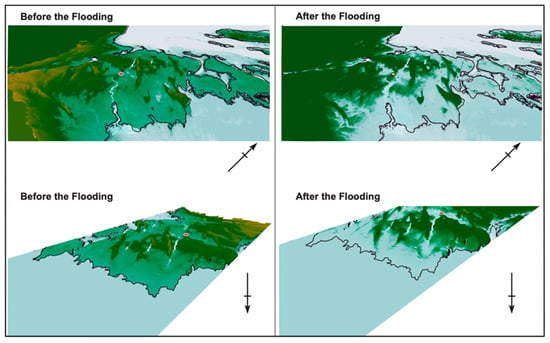 Geomorphological reconstruction of the palaeolandscape off the east coast of England c. 8.2 ka cal BP. Above: Coastline reconstruction at 8.2 ka cal BP and inferred direction of tsunami advance following the modelling of Hill et al. []. Below: 3D rendering of the area from northern and southern perspectives before and after inundation (arrow represents north direction).