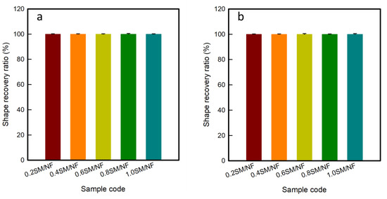 Moreover, it can also be seen from Figure 4 that, as the thickness of 3D-printed sinusoidal sample/nylon composite increased, the difference between average recovery rates of two successive 3D-printed sinusoidal pattern thicknesses became smaller for 50 cycles. The difference between the average recovery rate of 0.2SM/NF and 0.4SM/NF was found to be 1.0°/s. The difference between 0.4SM/NF and 0.6SM/NF was 0.6°/s. The difference between 0.6SM/NF and 0.8SM/N was 0.5°/s. The difference between 0.8SM/NF and 1.0SMNF was 0.1°/s. Thus, as the thickness of the 3D-printed sinusoidal sample/nylon composite increased, the average recovery rate became closer to each other.