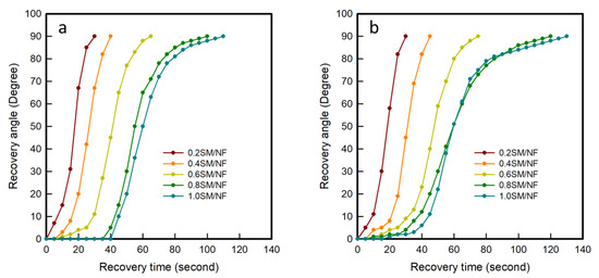 Figure 5 shows differences of the recovery angle on the time of 3D-printed sinusoidal sample/nylon composite with various thicknesses and various cycles. The recorded video of the recovery process was analyzed and the recovery angles were measured every 5 s. The recovery process videos during the first cycle of 3D-printed sinusoidal sample/nylon composite with various thicknesses are shown in Video S1–S5 of the Supplementary Materials. The visual demonstration of the shape recovery process of 3D-printed sinusoidal sample/nylon composite with various thicknesses during the first cycle and 50th cycle is presented in Tables S6 and S7 of the Supplementary Materials. The ‘S’ shaped curves for differences of recovery angles on time of 3D-printed sinusoidal sample/nylon composites with various thicknesses indicated that the recovery process can be divided into three different stages. The deformed shape recovered slowly at the initial and final stage. However, the recovery rate was more rapid in the middle stage and most of the recovery happened during this stage. Originally, at the beginning, the specimen takes time to reach Tg. Once the specimen reaches Tg, it starts to recover by releasing stored force. However, at the initial stage, the release of the stored force is slow due to the heavy friction among molecules. The recovery is slow at the initial stage. At the final stage, the shape recovery rate became slow once again because most of the stored force had been released with little of it remaining [24,25].