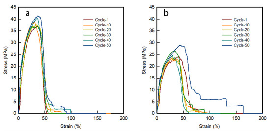 During the tensile test, three samples were tested three times and mean value was taken. However, in this case, the appearance of one sample is presented to make the presentation concise and precise. Tensile behavior showed the nature of failure of 3D-printed sinusoidal sample/nylon composites during the tensile test. As shown in Table 3, the 3D-printed sinusoidal pattern and nylon fabric did not break at the same point or same time. The strength and strain of raw nylon fabric was lower than the strength and strain of 3D-printed sinusoidal sample/nylon composite with various thicknesses. Therefore, at the beginning of the tensile test, the nylon fabric and 3D-printed sinusoidal pattern bear the load together. However, after a while, nylon and a 3D-printed sinusoidal pattern got separated due to the different elongation property. Afterward, the nylon fabric got broken due to its lower strength. After the breaking of nylon fabric, the stress-strain curve slope became lower, which means that the specimen became less stiff. Then, the failure of a 3D-printed sinusoidal pattern took place. In addition, as shown in the stress-strain curve, after the failure of the 3D-printed sinusoidal pattern, the curve did not fall straight to a zero position. This is because, even though the nylon fabric broke first, it did not completely separate. There were some frictional forces working even after the breakage of 3D-printed sinusoidal sample. Thus, this study confirmed that the stress-strain phenomenon of a 3D-printed sinusoidal sample/nylon composite took place with three distinct stages for 50 cycles. First, separation of nylon and a 3D-printed sinusoidal pattern took place. Then breakage of nylon and breakage of 3D-printed sinusoidal pattern took place respectively.