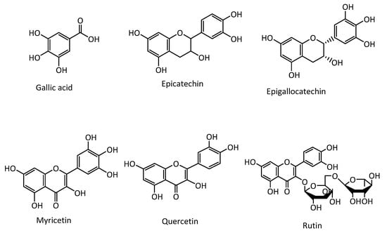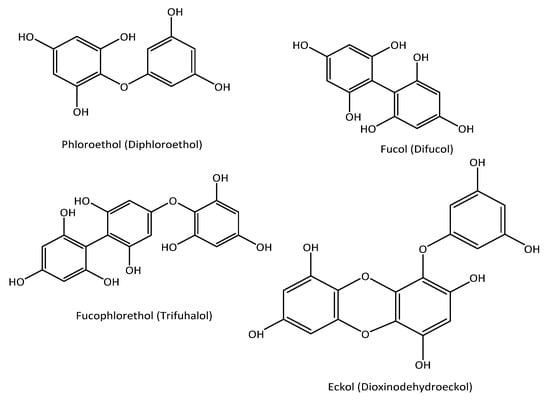 Several types of phenolic compounds were isolated and characterized from brown, green, and red seaweed. Both the type and composition of the phenolic compounds vary across the different genera of seaweed []. The most commonly reported phenolic compounds are simple phenolic compounds like gallic acid, epicatechin, epigallocatechin, catechin gallate, protocatechuic acid, hydroxybenzoic acid, chlorogenic acid, caffeic acid, and vanillic acid [,]. Several flavonoids like quercetine, hesperidin, myricetin, and rutin were also reported in marine seaweeds [,,,] (Figure 1). Phlorotannins are the most commonly reported complex phenolic compounds in several brown seaweed species. Phlorotannins are oligomers of a phloroglucinol (1,3,5-trihydroxy benzene) monomer unit, with a large molecular size ranging from 126 Da to several thousand Da. Depending on the nature of the linkage between the aromatic units, there are four different classes of phlorotannins. When the linkage between the phloroglucinol unit is aryl-ether (C-O-C), they are called phloroethols and fuhalols; those with phenyl linkage (C-C) are fucols; fucophloroethols have both phenyl and aryl-ether linkages, and ecols with a benzodioxin linkage [] (Figure 2). As secondary metabolites, phlorotannins play a series of recognized roles in the cell, such as anti-herbivory defense, antifouling activity, and UV protectants [].