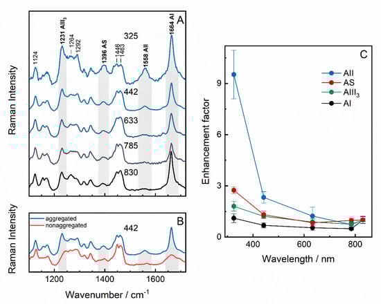 Raman spectra of aggregated (20 gm/mL) GGVVIA peptide in H2O excited at 325, 442, 633, 785, and 830 nm (A) and Raman spectra of aggregated and non-aggregated (5 mg/mL) GGVVIA in H2O excited at 442 nm. Spectra are normalized with respect to the peak intensity at 1463 cm−1; the spectral intensity is retained in both (A) and (B) panels. The (C) panel shows the dependence of the enhancement factor of AII, AS, AI, and AIII3 bands on the excitation wavelengths.
