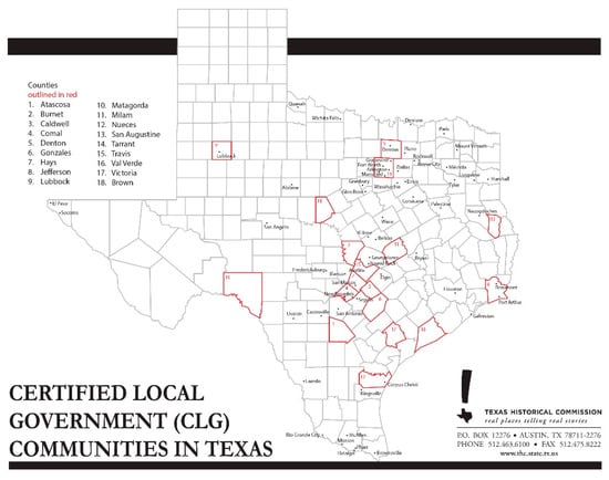 - Texas Historical Commission. CLG Program Staff. In Certified Local Government Annual Report for Fiscal Year 2017–2019; Texas Historical Commission: Austin, TX, USA, 2019. [Google Scholar]