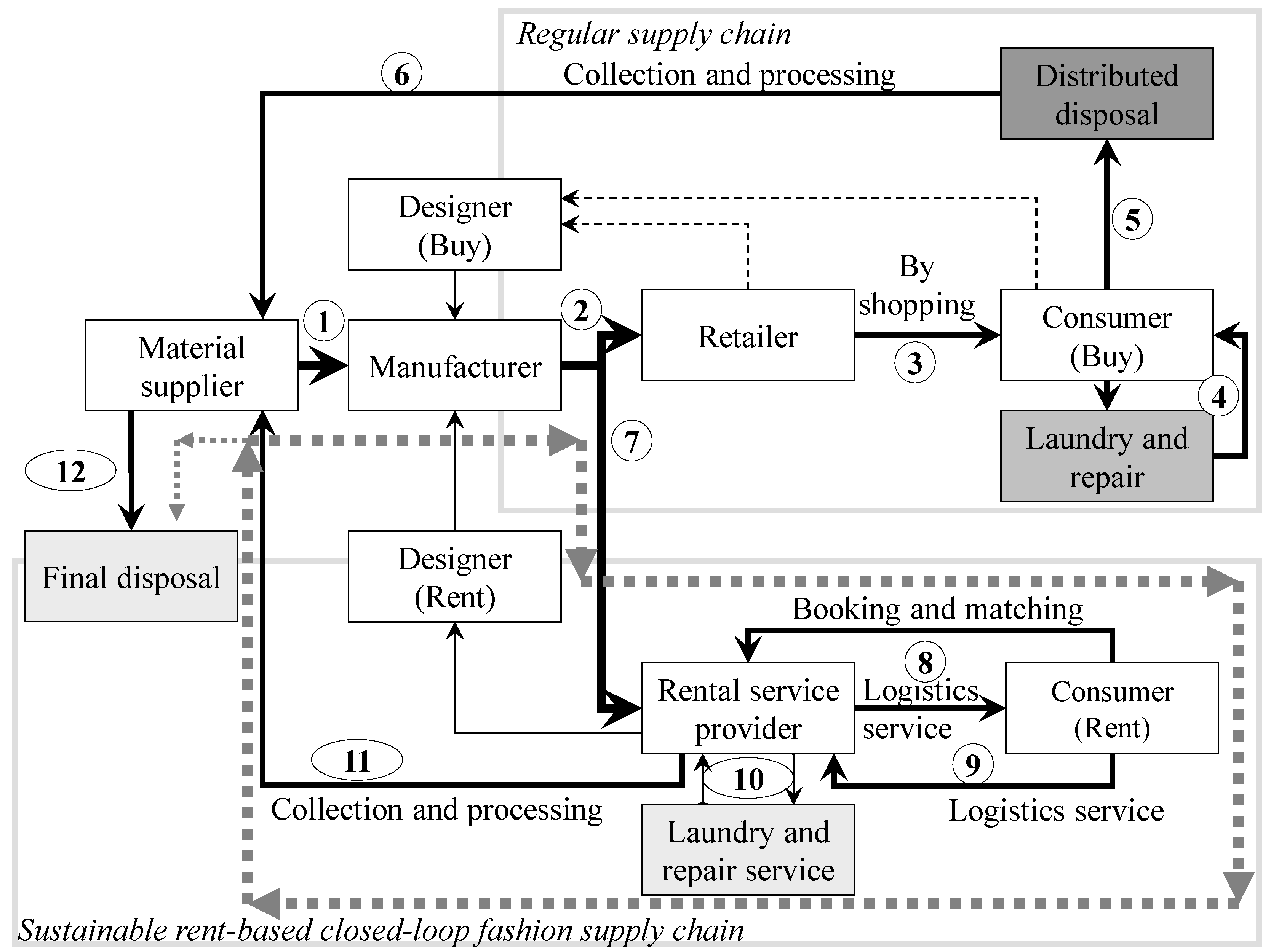 The rent-based closed-loop supply chain is described as follows. The fashion products used by rental services are manufactured according to the designs. The designs must be based on the careful investigation of the markets. The details of the fashion system include garment sizes, materials, colors and patterns, which should be perfectly researched by using data from the target market. Some consumers may become designers after they experience the buying and rental services. They may have different judgments on the fashion trends and consumer perceptions. The products are distributed to consumers by two channels: traditional sales by retails and rental services. From the traditional retailer channel, the consumers buy fashion products from the retailers and wash the products in use or dispose of the products by themselves in a distributed manner. Some of the disposals may be collected and reused by the material suppliers. Through the rental service channel, consumers book the fashion products by online or offline approaches. The matched products are used by the consumers, and then, they are sent to the rental service providers by logistics services. The laundry and repair processes are handled by the rental service providers themselves or outsourcing. Anyway, the products will be collected and treated in batches periodically. The laundry and repair process includes washing, disinfection and repair. Most products will be used again by the rental services. Some out-of-date or worn-out products will be sent to the material suppliers for further reuse engineering processes. By retailing and especially rental services, the data of consumer buying and rental behavior can be collected for forecasting fashion trends. Actually, the rental service could have a stronger fashion discovery capability than retailing, because the consumers may communicate with the rental service providers with higher frequencies.